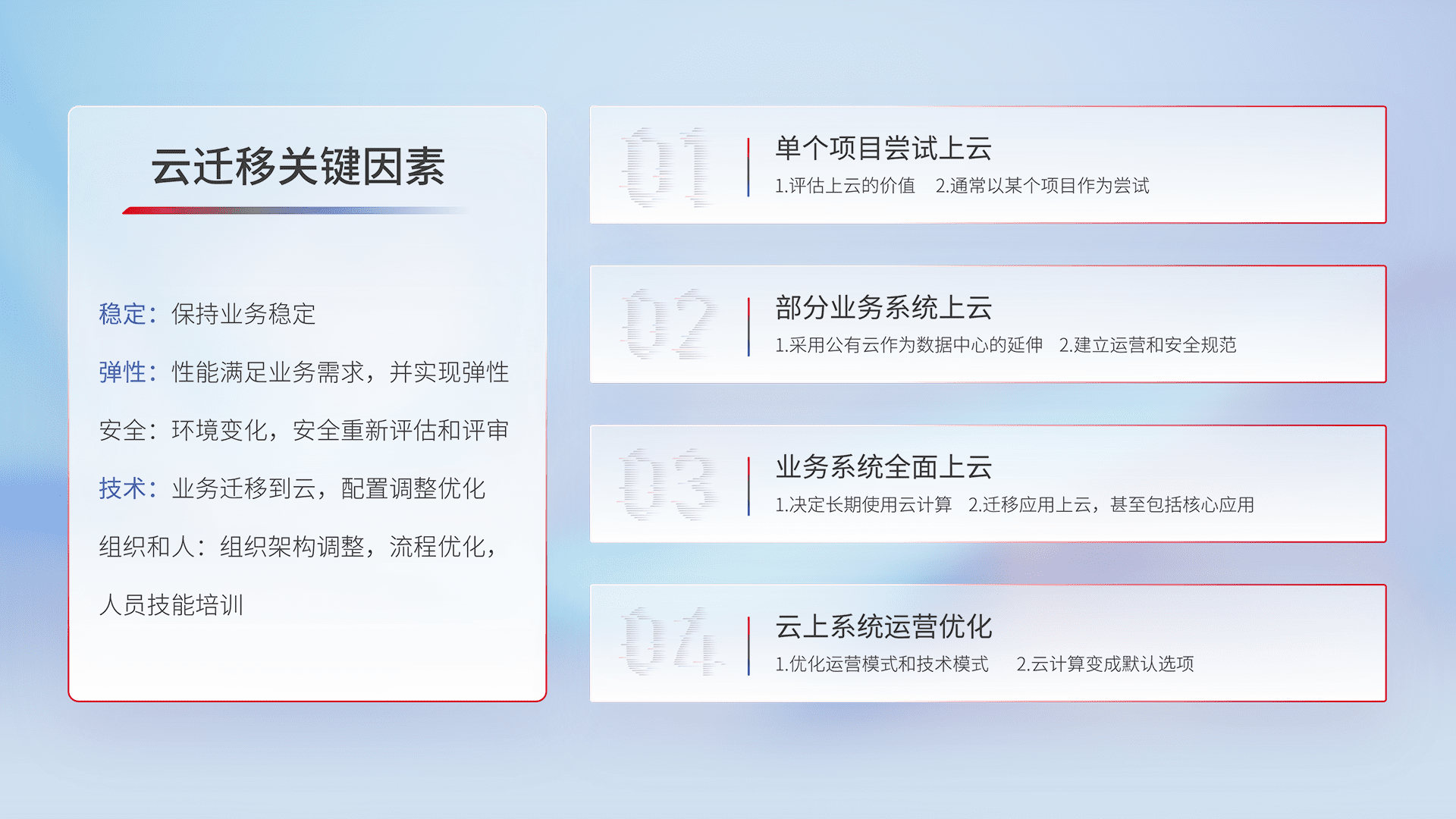 结合实际业务,,,,从规划设计、、云平台选型、、云原生改造、、数据迁移、、集成交付,,迁移全过程为客户识别最佳上云路径,,,做好风险识别管理,,,,设计网络架构、、、、身份权限、、、、安全审计合规、、操作审计、、日志审计、、、监控告警策略、、、多站点容灾设计等,,,对云上基础设施进行整体规划,,,,提升IT治理水平,,,以满足弹性、、、高可用、、、高性能的需求。。。。